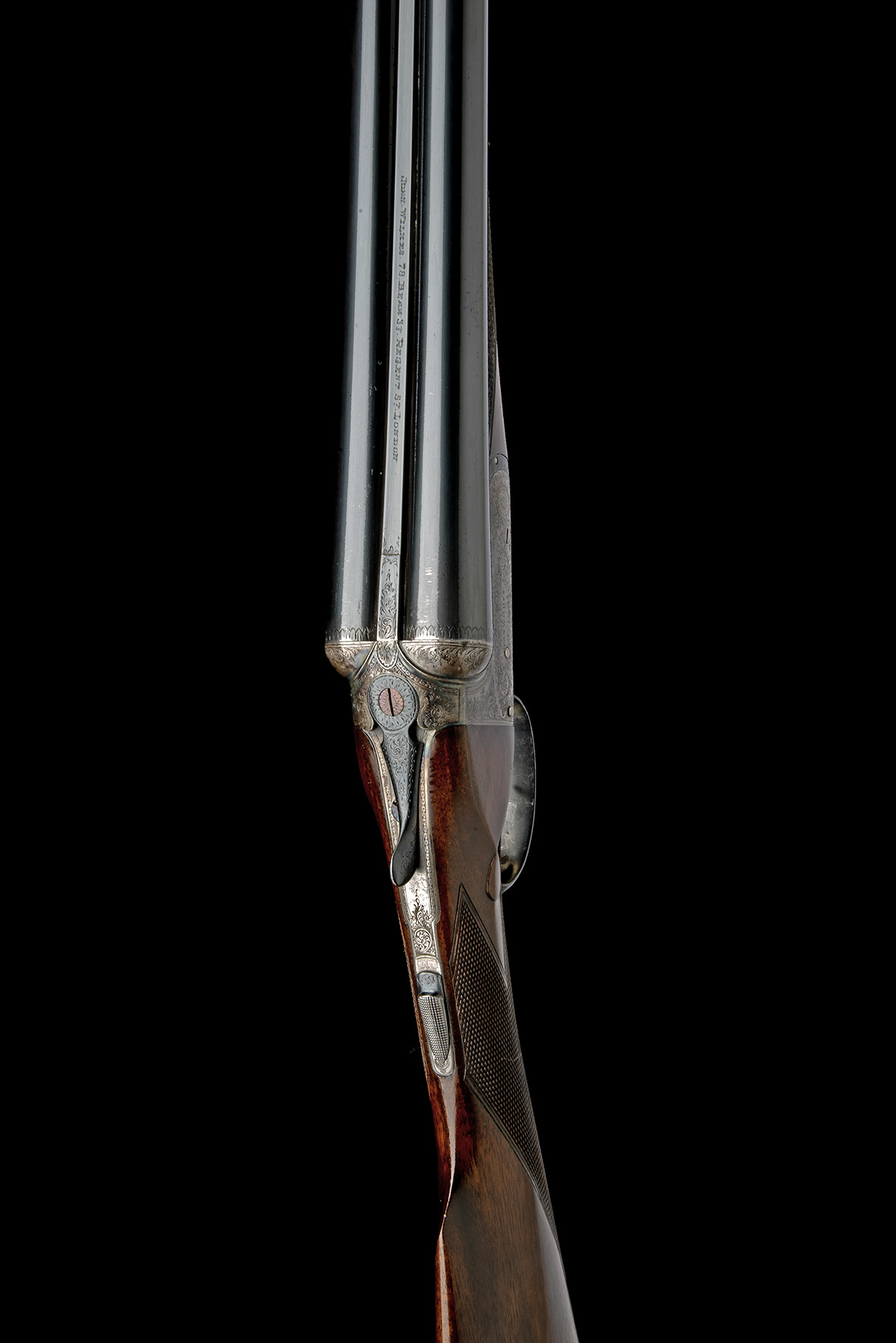dated 1937, 28in. nitro barrels, rib engraved 'JOHN WILKES. 79. BEAK ST. REGENT ST. LONDON.', 2 1/2in. chambers, bored approx. 1/2 and 3/4 choke, automatic safety, beaded border and acanthus scroll engraving, retaining much original colour-hardening and finish, 14 3/4in. stock including 7/8in. extension, weight 6lb. 13oz., in a brass-cornered leather case with detached William Evans trade label
