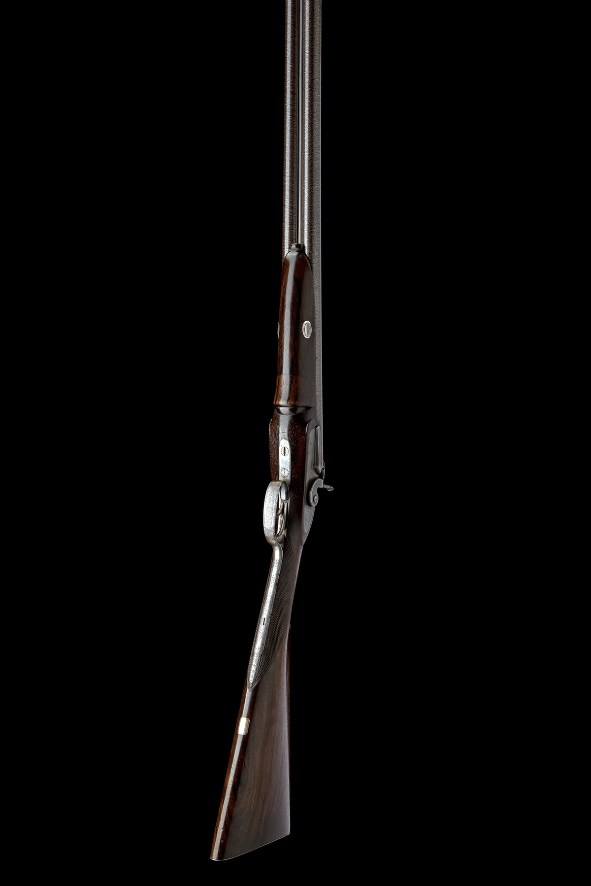 circa 1865, with browned laminated 29 1/4in. barrels, the top-rib signed 'WESTLEY RICHARDS 170 NEW BOND ST. LONDON', Westley Richards improved single-bite toplever snap-action, patent no. 2623 of 22nd October 1864, use number 368, scalloped fences, broad blued top-lever marked 'WESTLEY RICHARDS PATENT', borderline engraved colour hardened bar-action locks signed 'WESTLEY RICHARDS', colour hardened hammers, chequered walnut butt-stock with crab-claw joint to the smooth splinter fore-end (wood renewed at joint of fore-end), moulded horn tip, fair amount of period finish and complete with its leather covered oak casing lined and compartmented in green baize, parchment maker's label inside lid and including an exemption from proof certificate (no. c4745) and a letter from Westley Richards dated 1990 saying this shotgun was once part of their collection