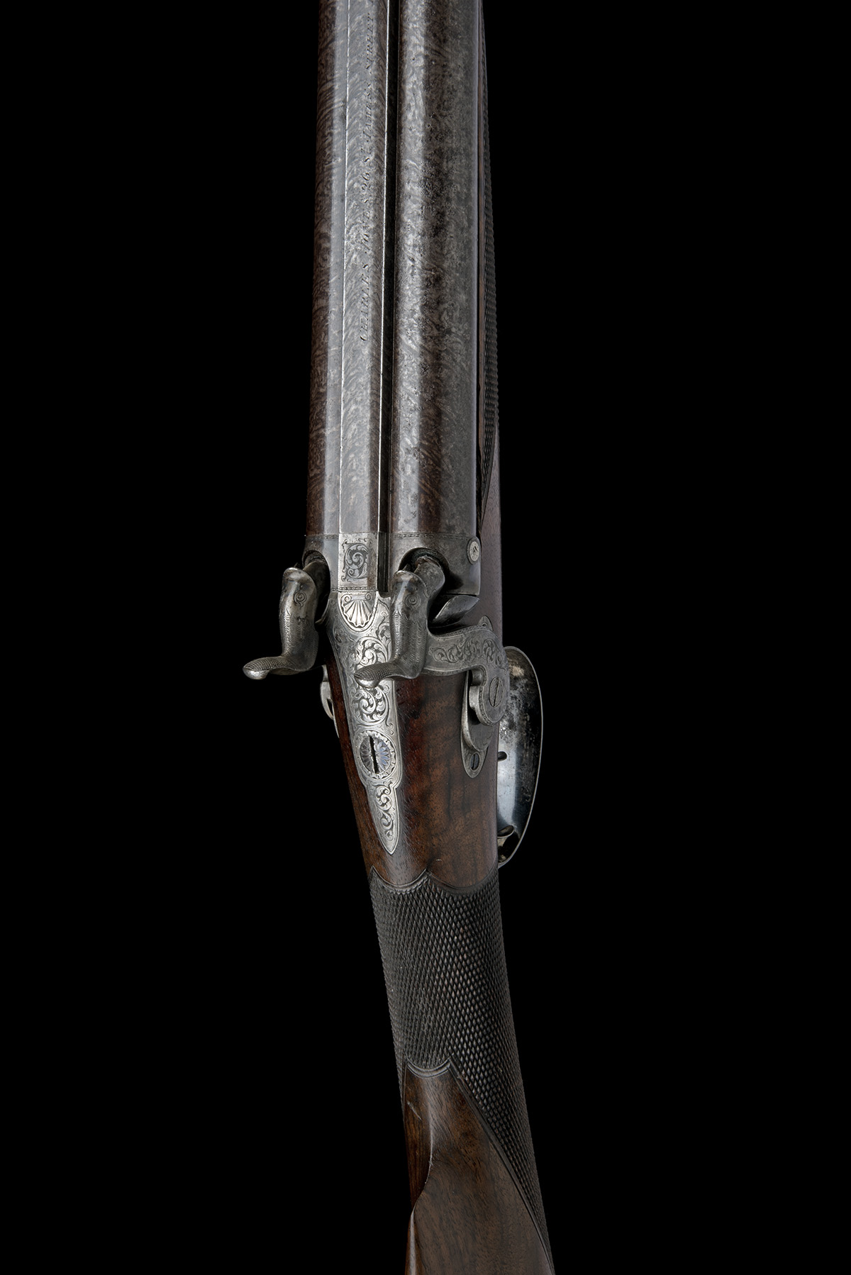 built to his patents 6394 & 6436 of 1833, with browned damascus 30in. barrels, the top-rib signed 'CHARLES JONES 26 ST JAMES'S STREET LONDON, GUN MAKER TO H.R.H PRINCE ALBERT', bead fore-sight, colour hardened moulded breech-blocks with platinum vents and scroll engraving to rib-end, borderline and scroll engraved top-tang, border and scroll engraved dolphin headed hammers mounted on small scroll engraved oval stepped side-plates, chequered walnut half-stock, the broad border engraved trigger-plate action signed 'CHARLES JONES PATENT WATERPROOF LOCKS WITH CONCENTRIC SEARS & TRIGGERS', short scroll engraved lower tang, blued heel-plate and gamescene engraved trigger guard bow, double triggers, engraved ramrod throat and brass mounted ebony ramrod, some isolated areas of patchy pitting but retaining much original finish and in its un-labelled mahogany guncase lined and compartmented in blue baize with lidded compartments concealing a fine powder and shot flasks, boxwood spare nipple pot, wad-punch, cap-tin, nipple key and an ebony three-piece cleaning rod with jag