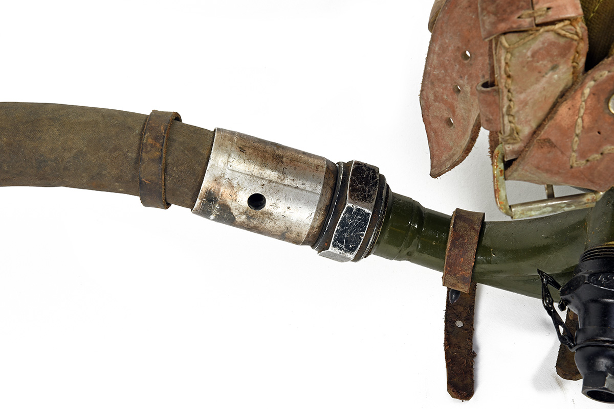 UK Buyers only A DEACTIVATED LPO-50 SOVIET LIGHT INFANTRY FLAMETHROWER, serial no. 026, circa 1960, lightweight metal frame, blacked finish, front with folding bipod, three mixer tanks painted green, with carrying straps, together with its 2021 deactivation certificate