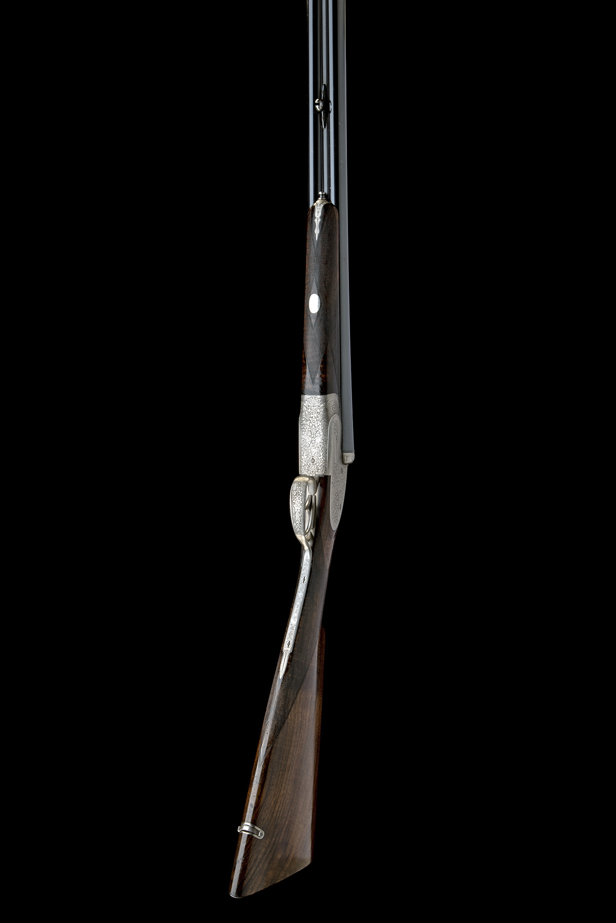26 3/4in. nitro barrels no. 3036, with raised tapered file cut rib with banner engraved 'F. DUMOULIN & CO. LIEGE', 2 3/4in. chambers, bored approx. imp. cyl. and 1/2 choke, bore dimensions marginal; shared fore-end, treble-grip action with hidden third bite, removable striker discs, automatic safety, articulated front trigger, rolled-edge triggerguard, fences carved in high relief with roses over scroll, the action, sideplates and furniture finely engraved with fine acanthus interspersed with sprays of roses and ribbon motifs, the triggerplate signed 'GRAVEUR L. SMEETS', bright finish, 14 1/2in. stock with integral self-retracting sling, weight 7lb. 2oz. (28in. barrels) and 7lb. (26 3/4in. barrels)