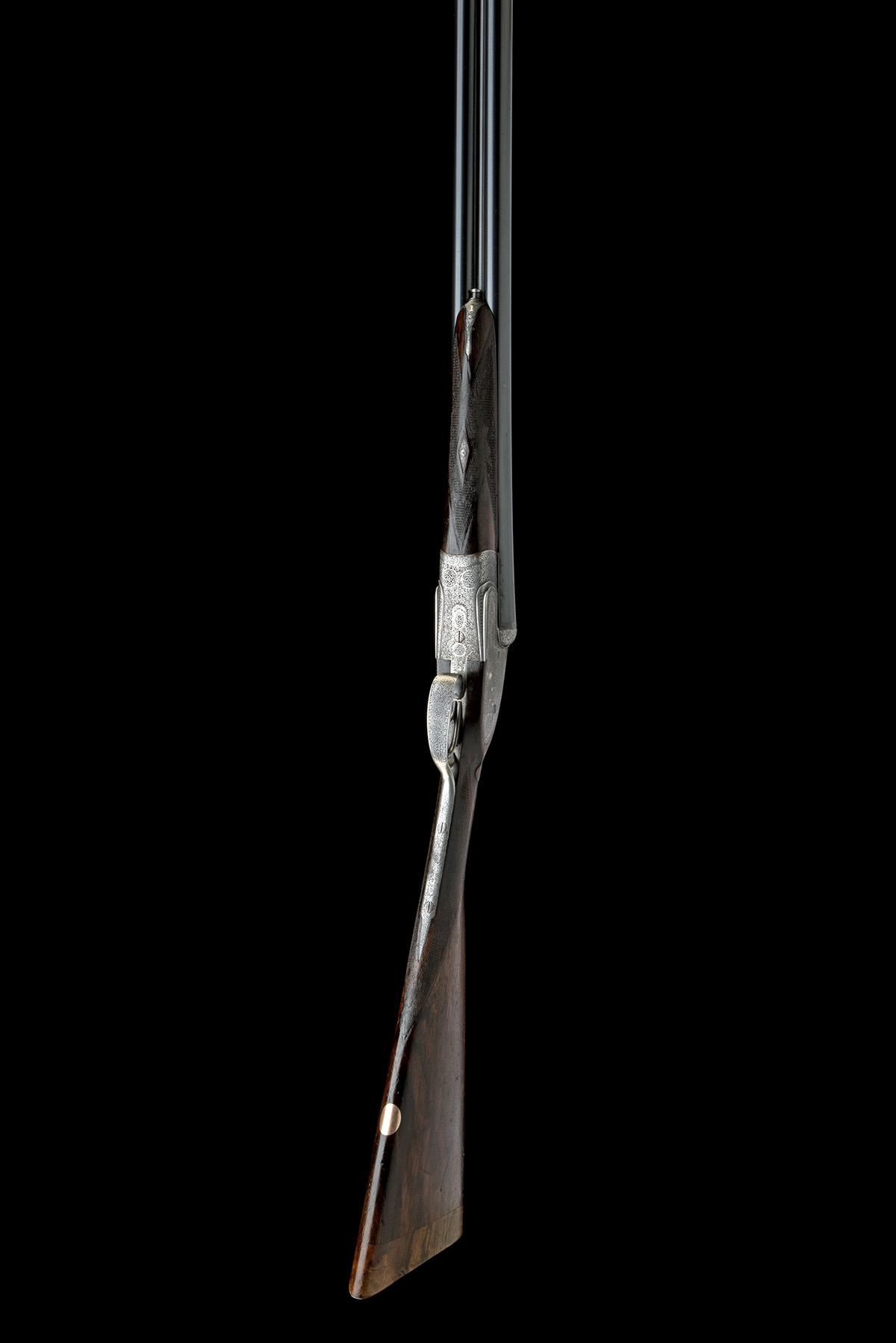 circa 1925, 'serial number' on barrel loop only, 30in. nitro reproved barrels (in 1974), the rib engraved 'J. GRAHAM & CO. 27 UNION ST. INVERNESS' and with scroll detailing at the breech end with a gold-inlaid '1' in an oval, 2 1/2in. chambers, bored approx. 1/4 and full choke, treble-grip action with hidden third bite, toplever gold-inlaid '1', automatic safety with gold-inlaid 'SAFE' detail, gold-inlaid cocking-indicators, profusely engraved with fine acanthus scrollwork with beaded and floral bordering and floral bouquets, the lockplates with 'J. GRAHAM & CO.' in scrolling banners, 15in. stock including 1 1/8in. wooden extension, weight 6lb. 12oz., in a leather case
