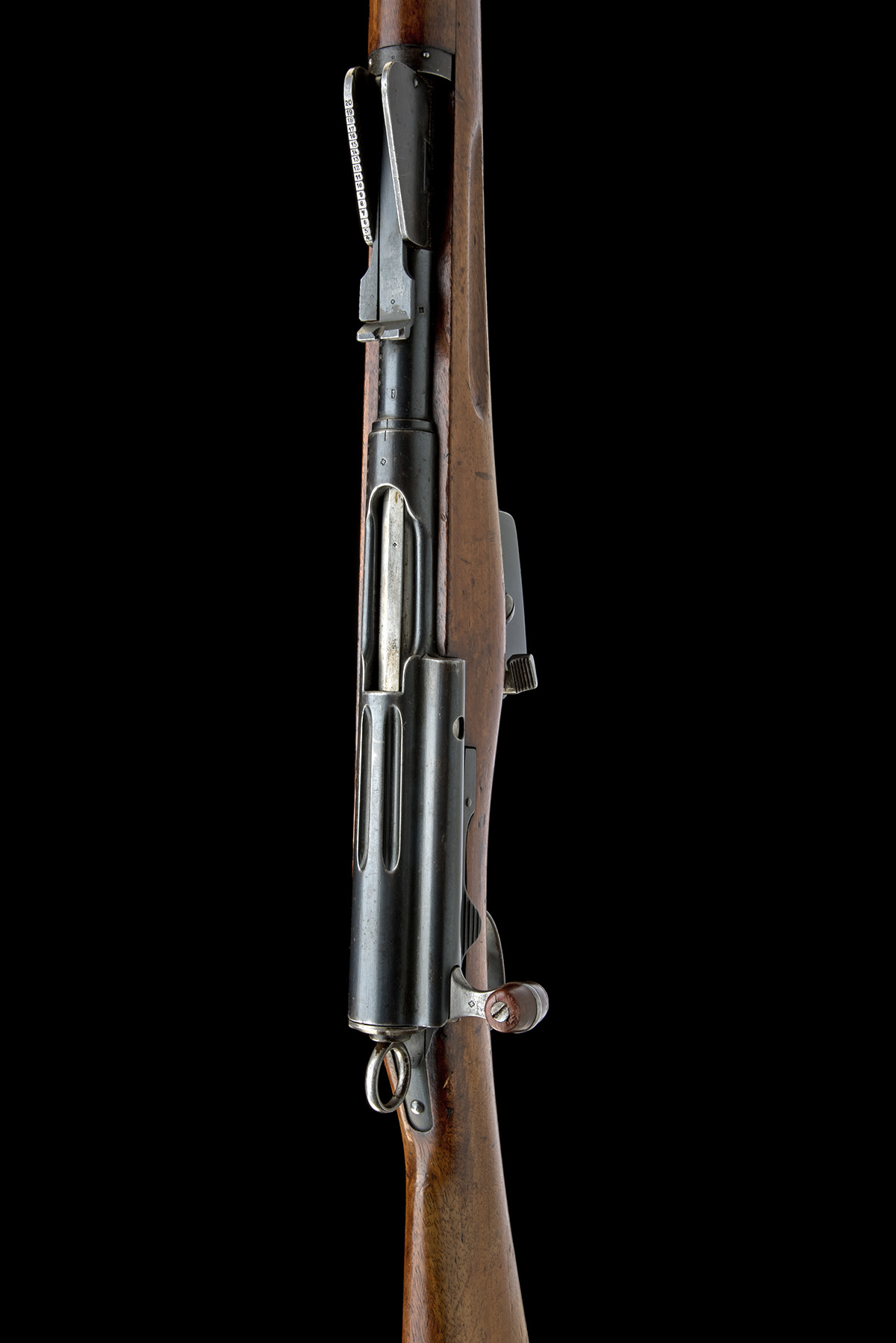 circa 1895, with 30 3/4in. barrel, dove-tailed blade fore-sight, elevating tangent rear-sight, blued blind-fluted receiver with brushed bright straight-pull toggle bolt and safety ring to rear, walnut full-stock with full hand-guard and stacking spike below muzzle, matching numbers