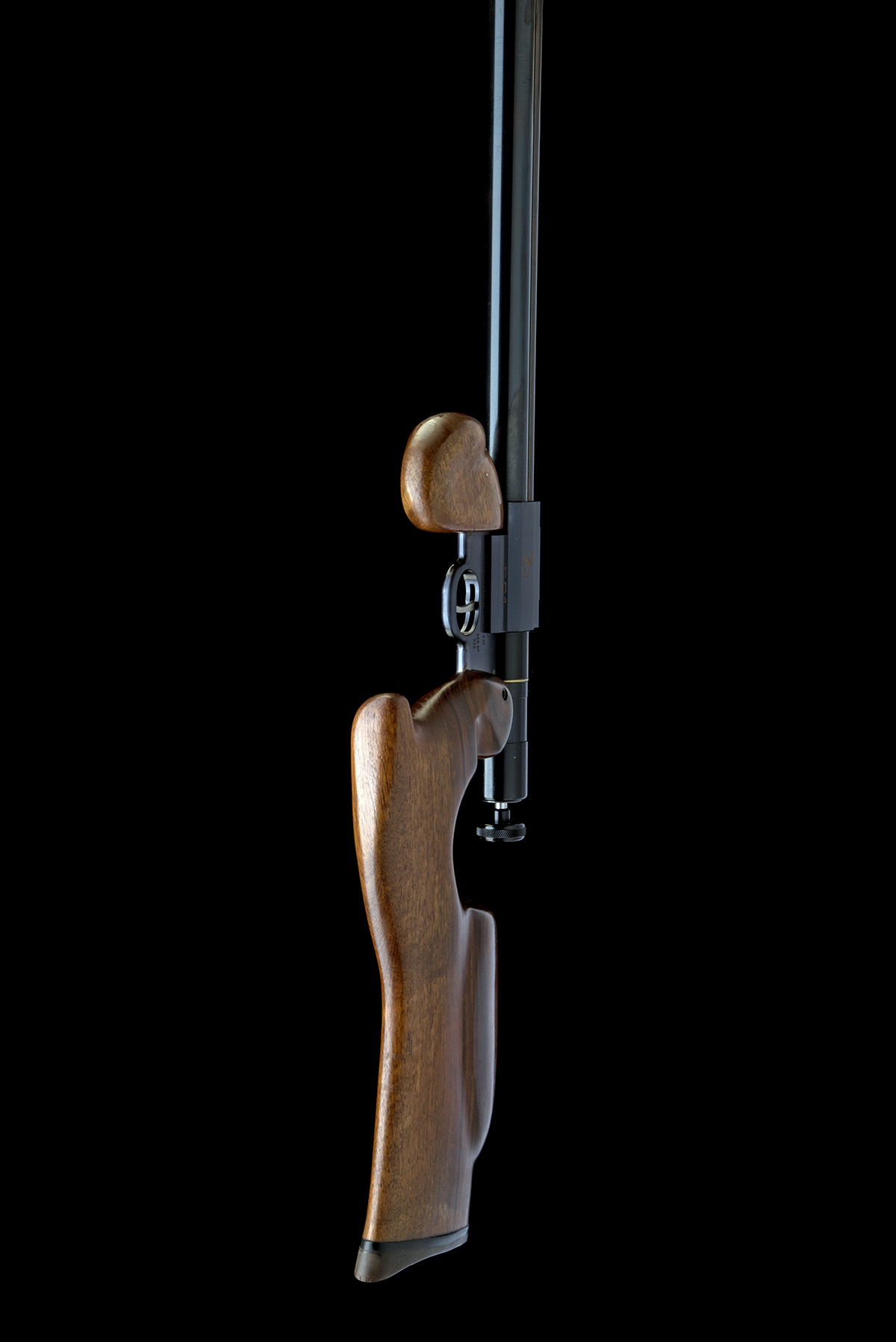 with 19 1/2in. barrel including attached muzzle-brake, rotating swing single-shot breech, large rear-mounted cocking-piece, the left side of action marked with 'BLACK FOX LTD. PORTLAND DT5 2JU', the serial number and a depiction of a seated fox above 'PC1', unusually shaped ergonomic walnut butt-stock, isolated semi pistol-grip fore-end and under-barrel air reservoir, tested, in a cordura gunbag