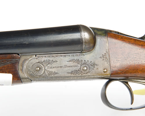 26in. nitro barrels, rib engraved 'DARLOW. NORWICH.', wall thicknesses below recommended minimum, 2 1/2in. chambers, bored approx. 1/4 and full choke, automatic safety, border and scroll engraving, retaining much colour-hardening, 14 1/4in. stock including 1in. ebonite extension, weight 5lb. 9oz.