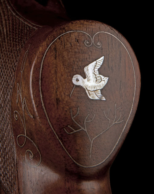 28in. nitro reproved barrels (in 2010) with 7mm ventilated matt top-rib and permanently attached fore-end, 2 3/4in. chambers, bored approx. 3/4 and full choke, hold-open toplever, cocking indicators, manual safety, gold-washed triggers, the blacked action carved in relief with acanthus scrollwork on a matt background surrounding vignettes of running stag and doe in wooded landscapes with a bright polished finish, the top fence and toplever carved in relief with acanthus scrollwork on a matt background in a bright polished finish, 14 3/4in. pistolgrip stock including 1in. ventilated rubber recoil pad, with raised cheekpiece inlaid with scrolling wire and a solitary mother of pearl mallard in flight, the stock and fore-end inlaid with scrolling wire with mother of pearl leaves and game birds, and mother of pearl inlaid drop points, weight 6lb. 13oz.