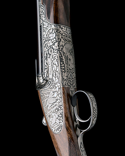 hold-open toplever, automatic safety with gold-inlaid 'SAFE' detail, rounded bar action, pinless lockplates with gold-inlaid cocking-indicators, non-selective single trigger, rolled-edge triggerguard,the action, lockplates and furniture deeply carved in high relief with baroque arabesques and beading, on a finely matted background, the fore-end decorated en suite, the lockplates carved with a flushed covey of bobwhite quail on the left and a brace of ruffed grouse on the right, the underside carved with a vignette of jinking woodcock, the triggerguard with a further woodcock in flight, the triggerplate signed 'S. J. KELLY', silver finish overall, 15 1/8in. highly-figured stock, weight 6lb. 3oz. (29in.) and 6lb. 1oz. (27in.), in its lightweight leather motorcase with provision for both sets of barrels and with canvas and leather outer, the case lid with engraved silver trade label