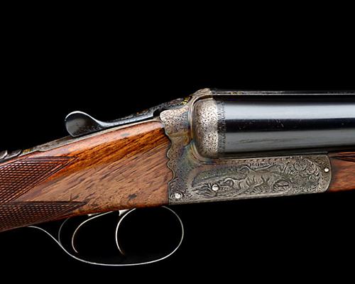 28in. nitro barrels, rib engraved 'H. GROVE. GUNMAKER. 27 1/2. WHITTALL STREET. BIRMINGHAM. 4.', the breech end with acanthus scrolls and an oval gold-inlaid '2'. 2 1/2in. chambers, bored approx. imp. cyl. and 3/4 choke, slender scroll-back action with slim fences, toplever gold-inlaid 'H. GROVE' and '2', automatic safety with gold-inlaid 'SAFE' detail, profusely engraved with acanthus scrollwork and decorative borders, the action bar engraved with game scene vignettes of a nye of pheasants on the left and two pointers on the right, retaining some original colour-hardening and finish, 14 1/2in. well-figured stock including 7/8in. rubber recoil pad, fore-end with Deeley & Edge patent release catch gold-inlaid '2', decorative chequering borders and small horn finial, weight 6lb. 1oz.