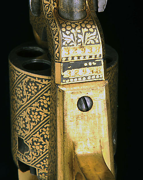 manufactured 1855 and decorated for the Indian market, with 7 1/2in. octagonal barrel, the top-flat signed 'ADDRESS COL COLT LONDON', plain cylinder, open iron frame, iron grip-straps and trigger-guard, smooth walnut grips, the whole pistol profusely and fully covered with gold damascened patterns of panelled vines and flowers with minimal losses to finish TOGETHER WITH its manufacturers English market oak case, compartmented and lined in green baize, Colt's instruction label to inside of lid and including an 'L' shaped nipple key, iron ball and bullet mould, large bag-shaped powder flask signed 'James Dixon & Son, Sheffield', a Joyce's cap tin and a pewter oil bottle
