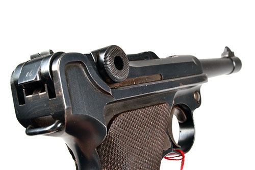 circa 1919, with 3 7/8in. barrel, dove-tailed fore-sight, undated breech, 'DWM' monogram stamped to the top of toggle, standing notch rear-sight, blued receiver and frame, chequered walnut grips, traces of 'straw' finish to the ancillaries, all matching numbers except later magazine