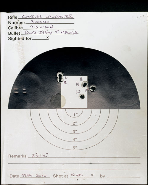26in. nitro reproved barrels (converted from .360 Express, London proofed in 2006), with raised matt rib, open sights and two folding leaf sights with white metal inlaid sight lines and marked for 100, 200 and 300 yards, ramp-mounted bead fore-sight, the breech end mounted with a Swarovski Z6 1-6x24 telescopic sight in hand-made quickly-detachable mounts (by Ron Wharton), the rings gold-inlaid 'CHAS. LANCASTER LONDON. CAL 9.3X74R NO. 30020', the tubes engraved CHARLES LANCASTER. LONDON. ENGLAND' at the breech end, treble-grip action with deeply carved serpentine fences, automatic safety with gold-inlaid 'SAFE' detail, gold-inlaid cocking-indicators, best bold acanthus scroll engraving, the lockplates gold-inlaid 'CHAS LANCASTER LONDON', the underside with a banner gold-inlaid with the calibre designation, retaining virtually full renewed colour-hardening and finish, 14 5/8in. highly-figured replacement stock with cheekpiece, engraved and colour-hardened steel pistolgrip-cap (with trap), fore-end with matching wood and with grip-catch release lever, weight 11lb. 4oz., in its best quality custom made brass-cornered leather case with full complement of accessories, including horn handled turnscrews, horn snap-block, inscribed bone striker pit (with spare strikers), snap caps, cleaning kit and nickel-plated oil bottle