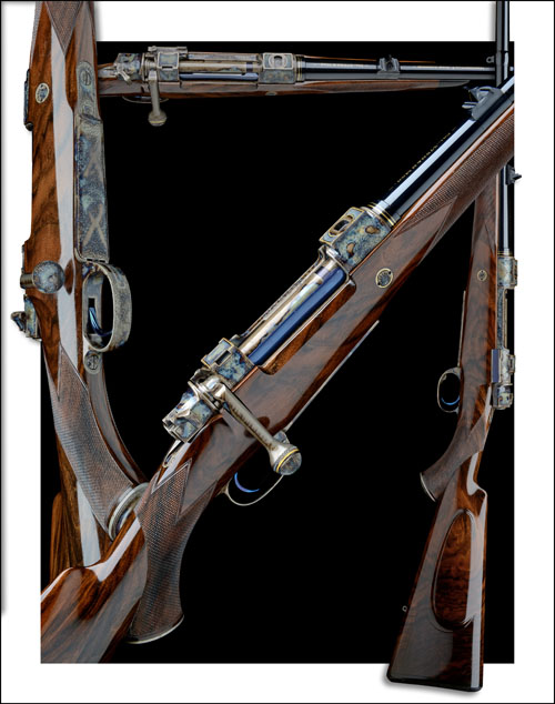 24 1/8in. nitro barrel gold-inlaid 'MANUFACTUR T. JUNG. LOHMAR', '-.375 H&H MAG.-', and with twin gold band details at the breech end, open sights with finely file cut finish with gold-inlaid sight line and marked for 100 metres, finely matted ramp-mounted gold bead fore-sight with gold line detailing and fold-over moonsight / protector, double square-bridge action with quickly-detachable telescopic sight mount bases with chequered tops and gold line bordering, colour-hardened bolt with progressive radial cut chequering and gold highlighting, engraved and colour-hardened recoil blocks with gold line border, hinged straddle floorplate with push button release, blued trigger, best acanthus scroll engraving overall, retaining virtually full colour-hardened finish, highly-figured pistolgrip stock with cheekpiece, colour-hardened and engraved steel pistolgrip-cap and sling eyes, 15in. pull including 1/2in. rubber recoil pad