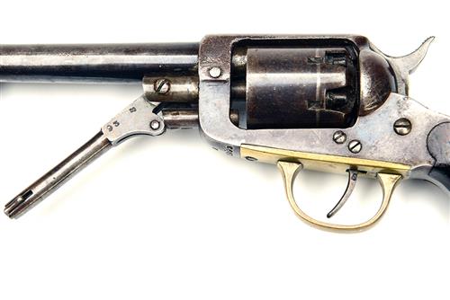 circa 1861, with round 4 1/4in. barrel poorly roll-stamped 'WESTERN ARMS CO NY.', solid iron frame, plain six-shot cylinder, single-action mechanism, smooth flared walnut grips, brass trigger guard and 'Whitney' type hinged under-barrel rammer, strong traces of finish remaining