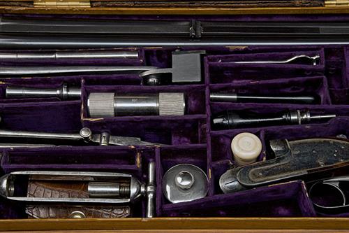27in. black powder only Whitworth-steel chopperlump barrels, the tubes engraved 'J. PURDEY & SONS, AUDLEY HOUSE, SOUTH AUDLEY STREET. LONDON. SIR JOSEPH WHITWORTH'S FLUID PRESSED STEEL', the rib partially matted and engraved 'MADE FOR R.B. RODDA & CO. GUN AND RIFLE MANUFACTURERS. CALCUTTA.', open sights with bone inlaid sighting triangle, one folding leaf sight with white metal inlaid sight line and marked for 200 yards, fine bead fore-sight with flip up moonsight, self-opening action with hidden third bite, side-clips, removable striker discs, bolted automatic safety with gold-inlaid 'BOLTED' and 'SAFE' details, arrow cocking-indicators, best fine acanthus scroll engraving with floral bouquets, retaining much original colour-hardening and finish, 14 1/8in. highly-figured pistolgrip stock with cheekpiece, engraved steel pistolgrip-cap, sling swivels and including 3/4in. rubber recoil pad, the underside inset in gold with a shield with blued enamel 'NS' monogram surmounted by a coronet, fore-end with grip-catch release lever, weight 9lb., in its brass-cornered crocodile skin bound oak case, the lid outer with central blank brass circular escutcheon and marked in gold 'HIS HIGHNESS THE MAHARAJ RANA OF DHOLPUR. 45 GAUGE. RIFLE NO. 14742', the interior lined with purple velvet, the lid interior with handwritten charges label, listing: '(powder) 120 Grains Curtiss & Harveys No.6, (wadding) thin card and greased cloth, (bullet) 325 Eley Ringed bullet, (cartridge case) 3 1/4 Solid drawn taper case', Purdey trade label and containing a virtually full complement of nickel plated reloading tools, many marked Purdey and some with the rifle serial number, one compartment lid top broken, small loss to inside upper oak lining