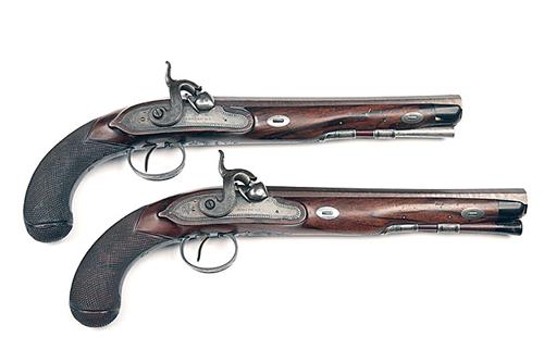 circa 1800 with later conversion to percussion, slightly swamped octagonal 9 1/4in. rebrowned barrels, white metal fore-sights, standing notch rear-sights to the engraved top-tangs, platinum plugs, border and trophy engraved flat locks with dolphin headed hammers, walnut full-stocks with chequered bag-shaped butts, single set triggers and metal and horn-tipped ramrods, traces of original finish except where noted, complete with their manufacturer's walnut storage box, compartmented and lined in green baize, Harcourt trade label inside lid and including a period ball-mould, later flask and cleaning rod