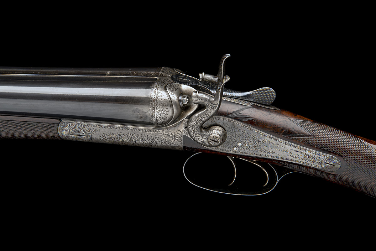 28 1/4in. (shortened) nitro reproved barrels, rib engraved 'HOLLAND & HOLLAND. 98. NEW BOND ST. LONDON.', 2 1/2in. chambers, bored approx. true cyl. and 1/2 choke, some pitting, rusting at rib towards muzzles, carved percussion fences, rebounding back-action locks with dolphin hammers, border and fine acanthus scroll engraving, 15 1/4in. stock including 1in. wooden extension, deep rounded fore-end wood (possible historic replacement), weight 6lb. 8oz., in a W.J. Jeffery labelled canvas case