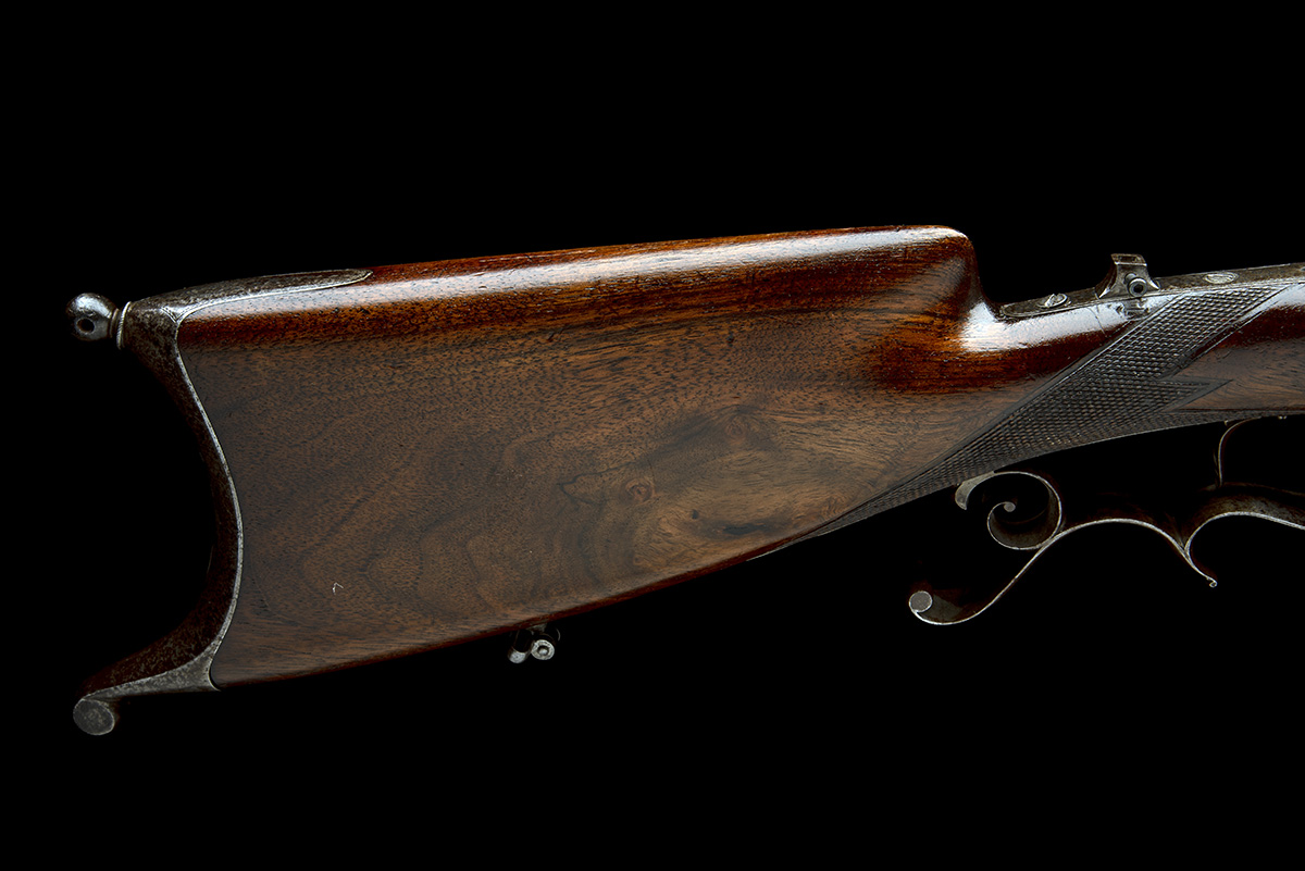 circa 1890, with octagonal 27 1/2in. barrel, the first third carved with a dove-tail for an adjustable rear-sight (absent), adjustable fore-sight with side protectors, colour hardened octagonal form receiver signed 'OTTO HODAPP CARLSRUHE' in white metal inlay on the left top-flat and surrounded by an engraved border panel of open white-metal scrollwork, smaller unsigned panels repeated to both the top and top-right flats, short straight bolt handle, no provision for safety catch, the top-tang with squared socket for an aperture sight (absent), walnut half-stock with heavy iron hooked butt-plate, double-set triggers within a complex trigger guard and iron swivels