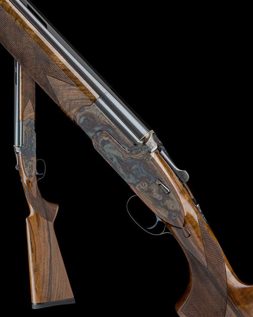 28in. nitro barrels (superior and steel shot proofed) with 10mm ventilated matt top-rib, ventilated mid-rib, 3in. chambers, multichokes (no spares), hold-open toplever, manual safety, hand-detachable lockplates with gold-inlaid cocking-indicators, border and acanthus scroll engraving, retaining full original colour-hardening and finish, the underside gold-inlaid 'WEBLEY & SCOTT',14 7/8in. figured pistolgrip stock including 1/2in. rubber recoil pad, weight 7lb. 7oz.