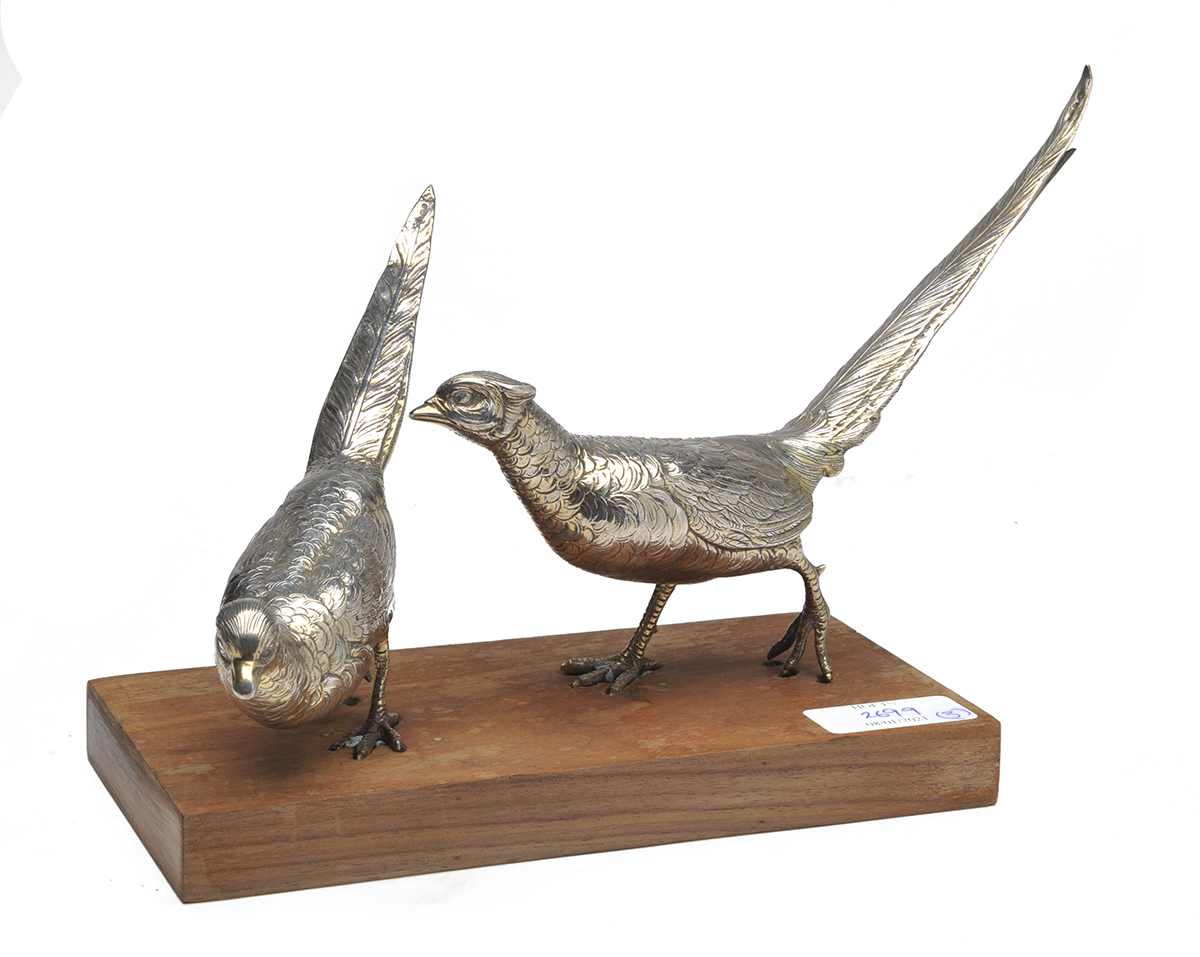 A BRACE OF CAST .925 SILVER PHEASANTS RETAILED BY ASPREY,