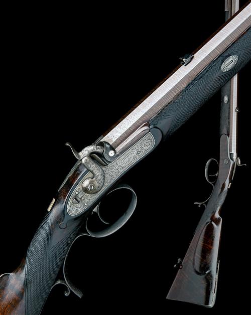 circa 1850, with octagonal twist iron 30in. barrel rifled in four grooves possibly for Jacob's winged bullet, the top-flat signed 'CHARLES. LANCASTER, 151 NEW BOND ST. LONDON' (refreshed), the squared patent breech-block with platinum vent, line and an inlaid poincon embossed 'CHARLES LANCASTER, LONDON', inlet blade fore-sight, dove-tailed rear-sight with twin folding leaves and one standing notch, all with platinum centre-lines, fully scroll engraved top-tang, border and scroll engraved bar-action lock signed 'C. LANCASTER LONDON', scroll engraved hammer with sliding safe, chequered walnut half-stock with vacant rectangular escutcheon to wrist, further initialled oval escutcheon behind lower tang, raised cheek-piece, iron patchbox with circular lid engraved with two lions to right hand side of butt, chequered iron heel-plate, single set trigger with chequered blade, chequered pistol grip spur to the lower tang, plain ramrod thimbles and replacement ramrod