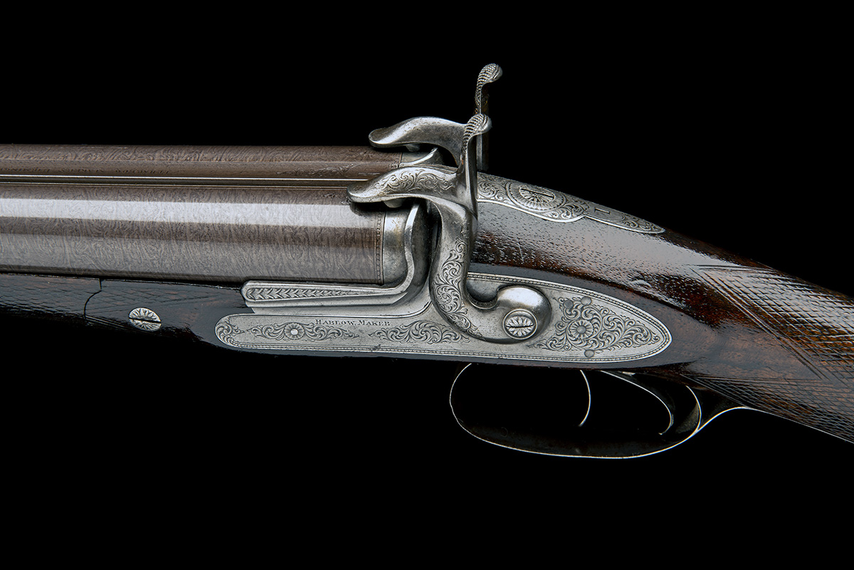 circa 1865 and built to the Harlow brothers's patent 2380 of 1863, with browned damascus 29 3/4in. barrels numbered for '1' of a pair and signed on top-rib 'J.T. HARLOW MAKERS: BIRMINGHAM' (possibly refreshed), engraved band at breech with scroll engraved detail around rib-end and pin apertures, scroll engraved swamped top-tang also numbered '1' for a pair, border and scroll engraved bar-action locks signed 'HARLOW, MAKER', scroll engraved hammers and breech supports, chequered walnut butt-stock (crack at wrist) with engraved iron furniture, chequered bar-in-wood fore-end with finger cut-out to operate the concealed opening lever flush inlet into the underside, cross-bolt fastening and horn tip