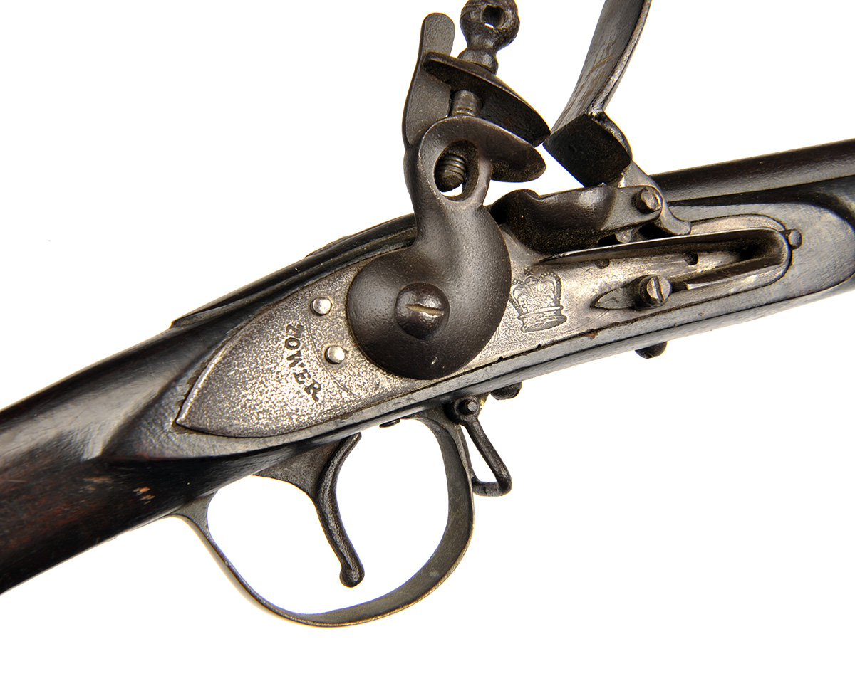 A 20-BORE FLINTLOCK SPORTING MUSKET FOR THE COLONIAL MARKET SIGNED TOWER, no visible serial number, circa 1830, with 39in. barrel (pitted externally), military style lock marked with a crown and 'TOWER', walnut three-quarter stock, brass furniture, iron ramrod and stirrup swivels