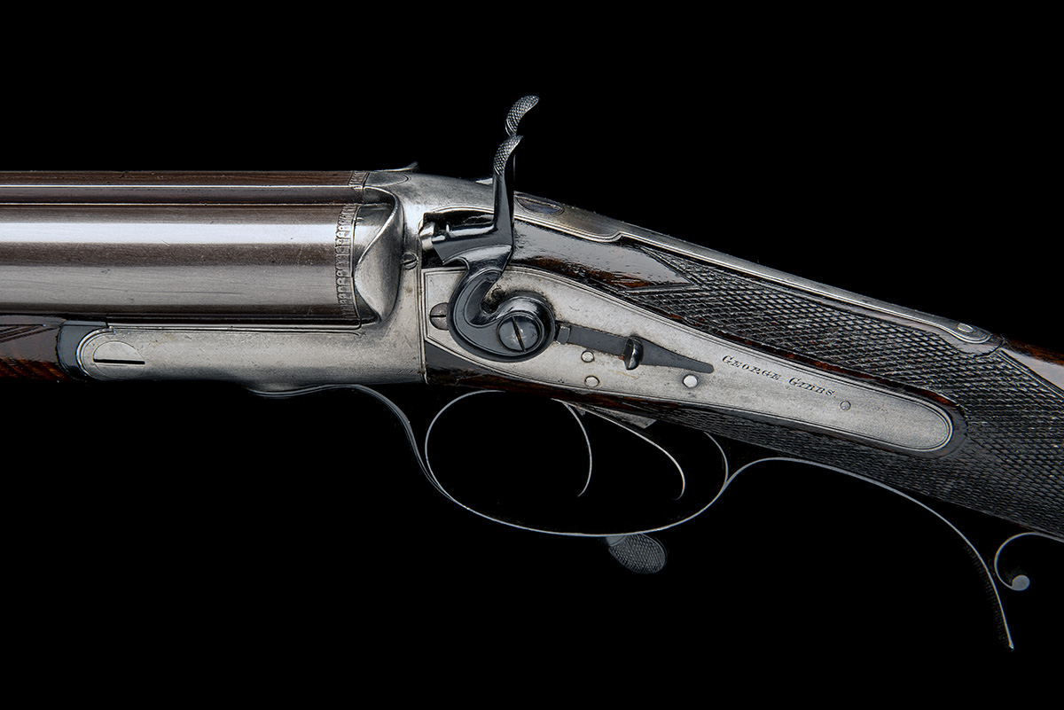 circa 1878, with 28in. re-blued barrels (faded), the flat raised top-rib signed 'GEORGE GIBBS, 29 CORN STREET BRISTOL' together with 'METFORD'S PATENT 167', small blade fore-sight, rear-sight with one standing and three flush-folding leaves, all with platinum centre-lines, engraved band at breech, plain borderline engraved standing breech and top-tang, plain borderline engraved back-action locks signed 'GEORGE GIBBS', sliding safes behind the low-profile reblued hammers, figured walnut butt-stock chequered at the wrist, iron furniture including chequered pistol-grip spur to the lower tang, 'Jones' swing double-bite under-lever and chequered walnut splinter fore-end, eyelet and button sling fixings