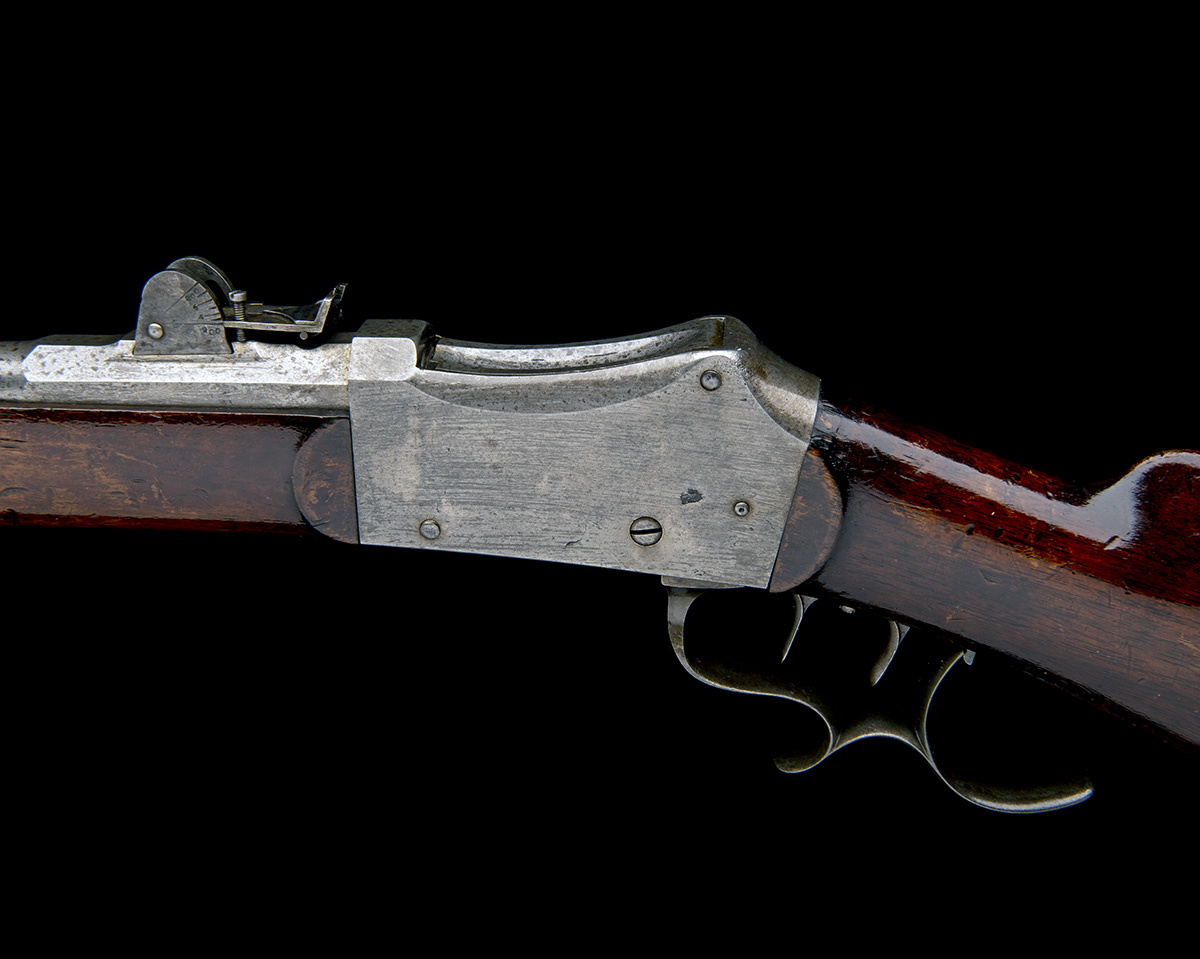 probably Swiss market circa 1885, with round 33in. barrel, octagonal breech, block and dove-tailed blade fore-sight, elevating tangent rear-sight, slab-sided receiver with tilting feed-ramp, walnut butt-stock with Swiss style iron heel-plate, complex finger-spurred trigger-guard forming the under-lever, double set triggers and walnut three-quarter length fore-end with twin barrel-keys, stirrup swivels and iron under-barrel clearing rod