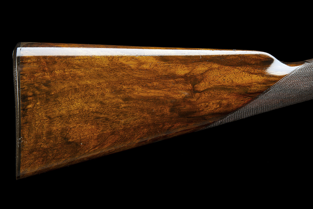 29in. black powder only fine damascus barrels, the rib engraved 'JAMES WOODWARD & SONS. 64 ST. JAMES'S STREET. LONDON.' and '2', 2 1/2in. chambers, bored approx. true cyl. in both, wall thicknesses well below recommended minimum, two minor dents to undersides of barrels near muzzles, Jones patent rotary underlever, carved percussion fences, rebounding back-action locks, fine border and acanthus scroll engraving, traces of original colour-hardening, 14 3/8in. figured stock with horn buttplate, weight 7lb.