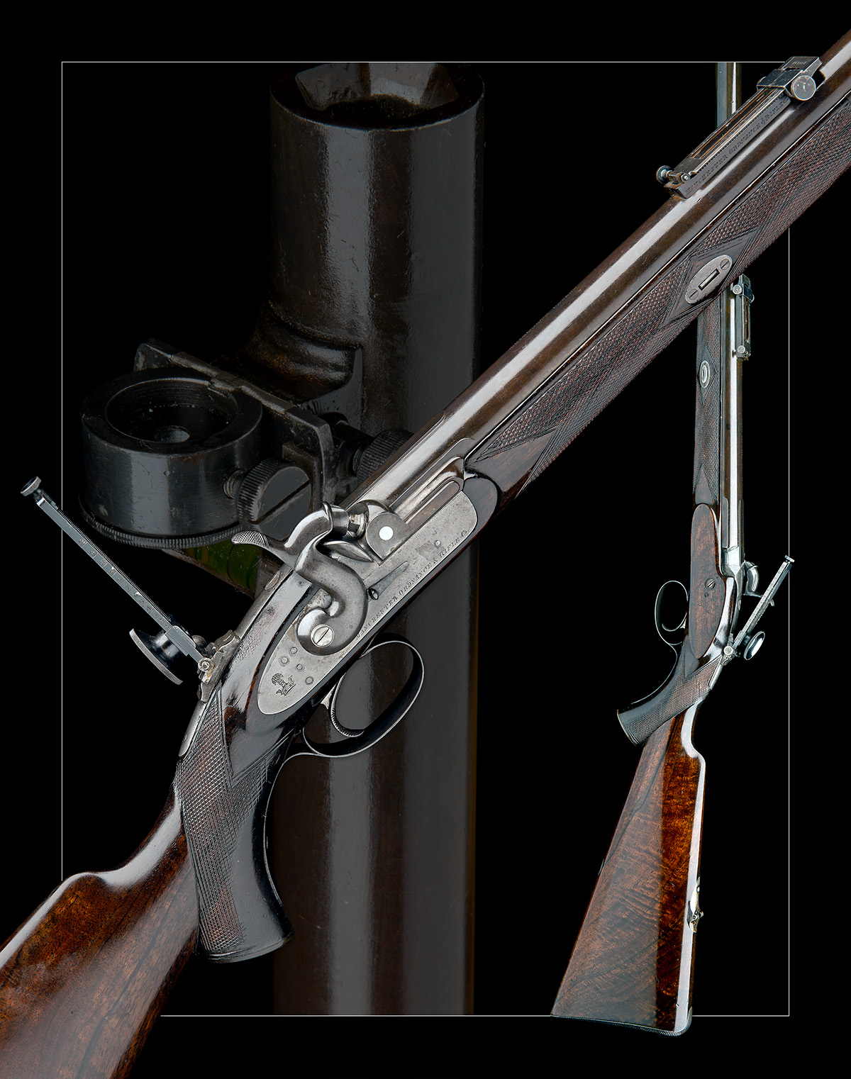 circa 1865 with 35 7/8in. re-blued round heavy barrel marked 'WHITWORTH PATENT' towards the breech, squared mounting-block for the dove-tailed windage adjustable tunnel fore-sight with spirit level, the mounting-block for the ladder rear-sight signed 'MANCHESTER ORDNANCE & RIFLE CO.', the ladder marked 'PATENT', squared patent breech (traces of colour), plain tang fitted with mounting-block for aperture vernier target sight (present), detented bolted lock signed 'MANCHESTER ORDNANCE & RIFLE CO.' and with the Whitworth trademark on the tail (colour faded), well figured walnut pistolgrip half-stock with chequered grip and fore-end (cracked and repaired at wrist), back position sight mount base inlet into comb, chequered iron butt-plate, horn fore-end cap and pistol grip cap, chequered trigger-blade, silver escutcheon to underside of stock and no provision for ramrod