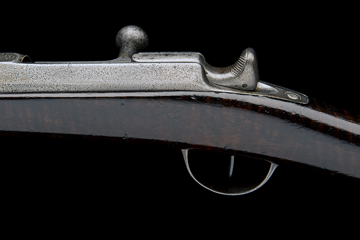 circa 1860, with 32 1/2in. octagonal to round barrel, block and blade fore-sight, elevating ladder rear-sight, octagonal receiver (cleaned of markings) with straight handled bolt retaining full length needle, rear-mounted cocking piece and walnut three-quarter stock with iron furniture