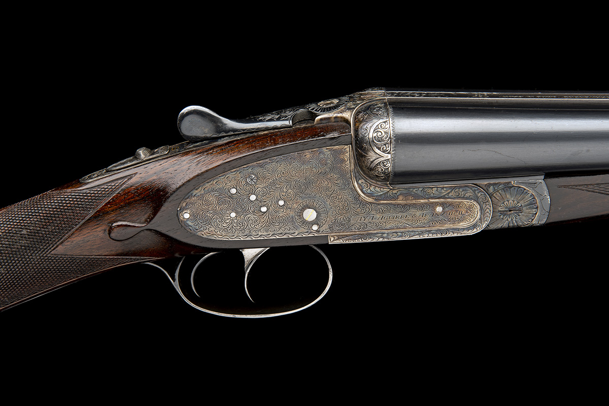 28in. nitro chopperlump barrels, 2 3/4in. chambers, bored approx. imp. cyl. and 14 choke, some internal marking, engraved arcaded fences, removable striker discs, automatic safety, hand-detachable lockplates, gold-inlaid cocking-indicators, articulated front trigger, rolled-edge triggerguard, acanthus scroll engraving, retaining much original colour-hardening and finish, 14 1/2in. stock, weight 6lb. 12oz.