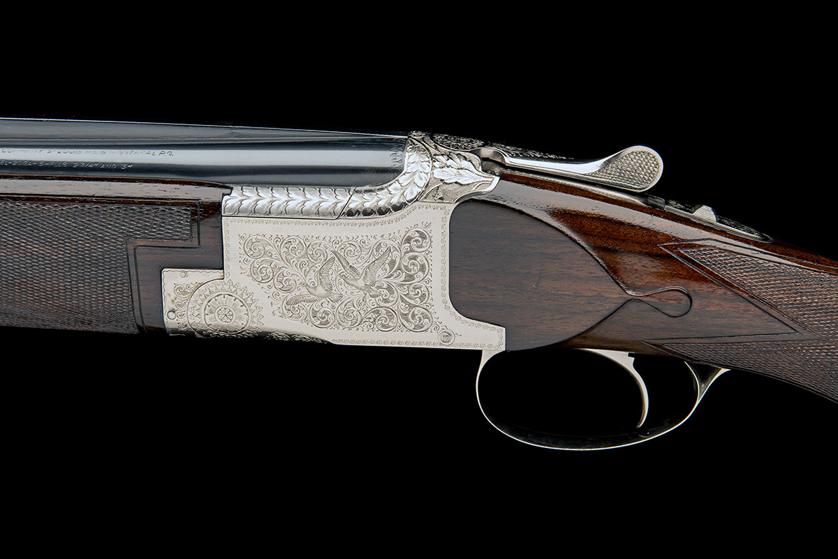 28in. nitro barrels with 5mm ventilated matt top-rib, 3in. chambers, multichokes (with spares), hold-open toplever, manual safety with integral barrel selector switch with gold-inlaid 'O', 'U' and 'S' detail, border and acanthus scroll engraving surrounding vignettes of pigeon in flight, bright finish, 14in. pistolgrip stock including buttplate, weight 6lb. 1oz.