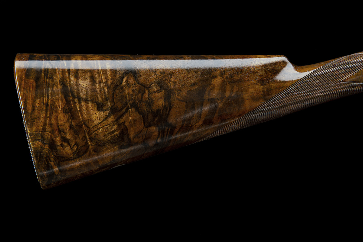 28in. nitro chopperlump barrels, rib engraved 'BOSS & CO. 13-14, CORK STREET, LONDON.', and gold-inlaid '2' at the breech end, 2 1/2in. chambers, bored approx. 1/4 and imp. cyl. choke, left wall at 18, toplever gold-inlaid '2', automatic safety with gold-inlaid 'SAFE' detail, gold-inlaid cocking-indicators, Boss 1905 improved patent single trigger, rolled-edge triggerguard, best fine acanthus scroll engraving with floral bouquets, retaining very slight traces of original colour-hardening and some renewed finish, 14in. highly-figured replacement stock, weight 5lb. 15oz.