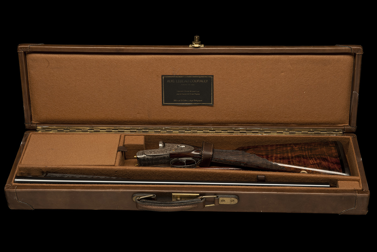 28in. nitro chopperlump barrels, the tubes engraved 'AUG. LEBEAU-COURALLY ARMES DE GRAND LUXE A LIEGE', 2 3/4in. chambers, bored approx. imp. cyl. and 1/2 choke, some light internal pitting, incorporating Holland & Holland style self-opening system, removable striker discs, automatic safety, hand-detachable lockplates, gold-washed tumbler pivots, some gold-washed internals, articulated front trigger, rolled-edge triggerguard, best bold acanthus scroll engraving similar to Holland Royal style, the triggerplate signed 'LOVENBERG', bright finish overall, 14 7/8in. highly-figured stock, the chequering with ornate bordering, including 3/4in. recoil pad, the fore-end decorated en suite and inset in gold with the Lebeau Courally crest with central pigeon motif and with banner inscribed 'IMPERIAL EXTRA LUX', weight 6lb. 14oz., in its lightweight case