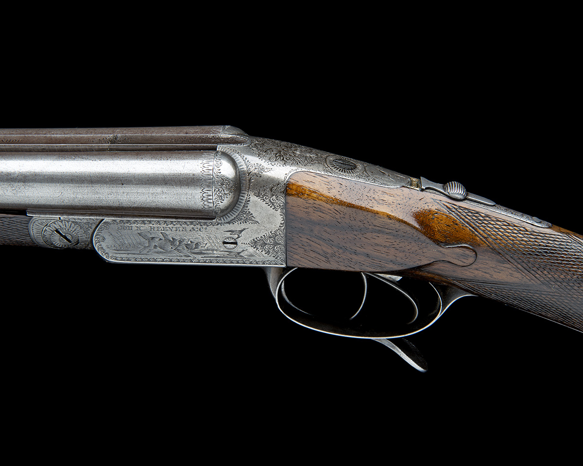 28in. nitro reproved damascus barrels, the rib engraved 'JOHN REEVES & CO. 18 & 20 WEAMAN ROW. BIRMINGHAM.', 2 1/2in. chambers, bored approx. 3/4 choke in both, action incorporating J. Reeves patent No. 2147 of May 1879, where each hammer is supported by a narrow plate, the undersides of which engraved ''REEVES PATENT', automatic safety, the action tang engraved with a floral bouquet and a vignette of feather in flight, border and partial acanthus scroll engraving surrounding scenes of hound flushing game, the triggerplate engraved with a further vignette, bifurcated triggerguard engraved with feather in flight, 13 1/2in. stock including steel buttplate, weight 5lb. 13oz., in a slightly distressed leather case