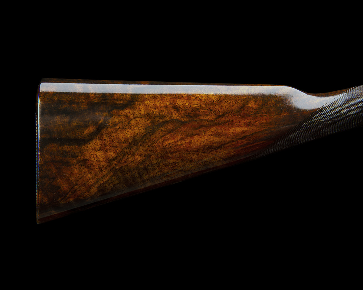 30in. nitro reproved chopperlump barrels, the rib engraved 'J. PURDEY & SONS. AUDLEY HOUSE. SOUTH AUDLEY STREET. LONDON. MADE OF SIR JOSEPH WHITWORTH'S FLUID PRESSED STEEL', and '2' at the breech end, 2 1/2in. chambers, bored approx. 1/4 and imp. cyl. choke, right wall thickness at 18, carved percussion fences, rebounding back-action island locks with dolphin hammers, fine acanthus scroll engraving with floral bouquets, brushed bright and reblued finish overall, 14 1/4in. well-figured stock, weight 6lb. 12oz.
