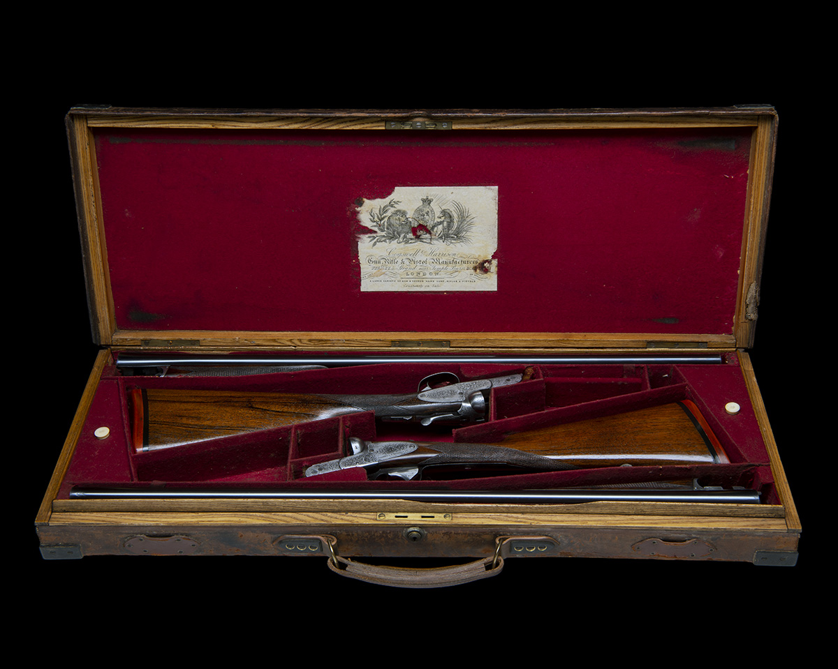 30in. nitro barrels, the ribs engraved '1' and '2', and 'COGSWELL & HARRISON LTD. THE AVANT TOUT. 141 NEW BOND ST. & 226. STRAND. LONDON.', 2 1/2in. chambers, bored approx. true cyl. and 1/4 choke (both), No.1 left wall at 18, treble-grip actions, automatic safeties with gold-inlaid 'SAFE' detail, the safety catches engraved '1' and '2', border and acanthus scroll engraving, the decorative sideplates engraved en suite, 14 1/4in. stocks including 3/4in. rubber recoil pads, weight 6lb. 8oz. (No.1) 6lb. 7oz. (No.2), in their makers brass-cornered oak and leather double guncase