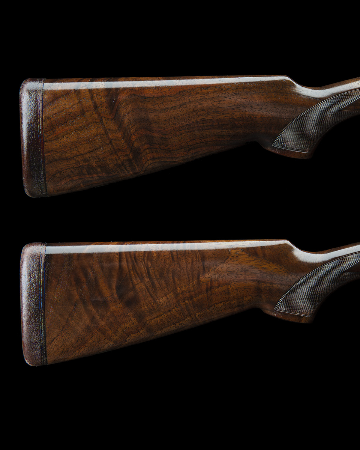 29 1/2in. nitro barrels with 6mm ventilated matt top-ribs, gold-inlaid '1' and '2' at the breech ends, 2 3/4in. chambers, bored approx. imp. cyl. and 1/4 choke, hold-open toplevers gold-inlaid '1' and '2', automatic safeties with integral barrel selector switches, gold-washed triggers, floral and acanthus scroll engraving, the decorative sideplates with game scenes of pheasant and woodcock, the triggerplates with the model designation and signed 'Bottega C. Giovanelli', bright finish, 15 1/4in. figured pistolgrip stocks including 1in. leather covered recoil pads, weight 6lb. 4oz. and 6lb. 6oz.