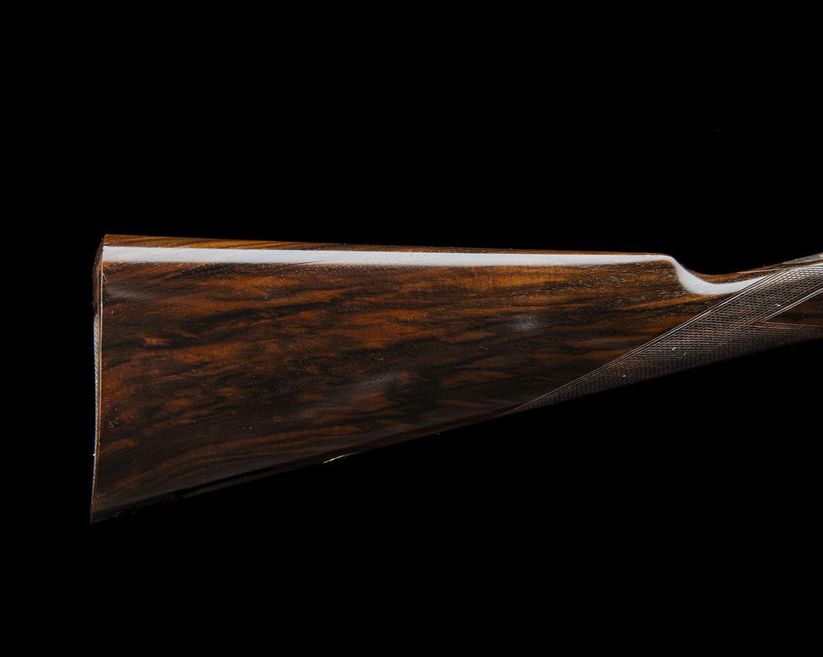 26 3/4in. nitro reproved barrels (repairs to lump), the tubes engraved 'MANUFACTURE LIEGEOISE D'ARMES A FEU. SOCIETE ANONYME. LIEGE. BELGIQUE.' and the matt rib engraved 'ACIER COCKERILL.', 2 3/4in. chambers, bored approx. true cyl. in both, bolstered treble-grip action with hidden third bite, removable striker discs, automatic safety with gold-inlaid 'S' detail, articulated front trigger, border and partial scroll engraving, 15in. figured replacement stock, weight 7lb. 1oz.