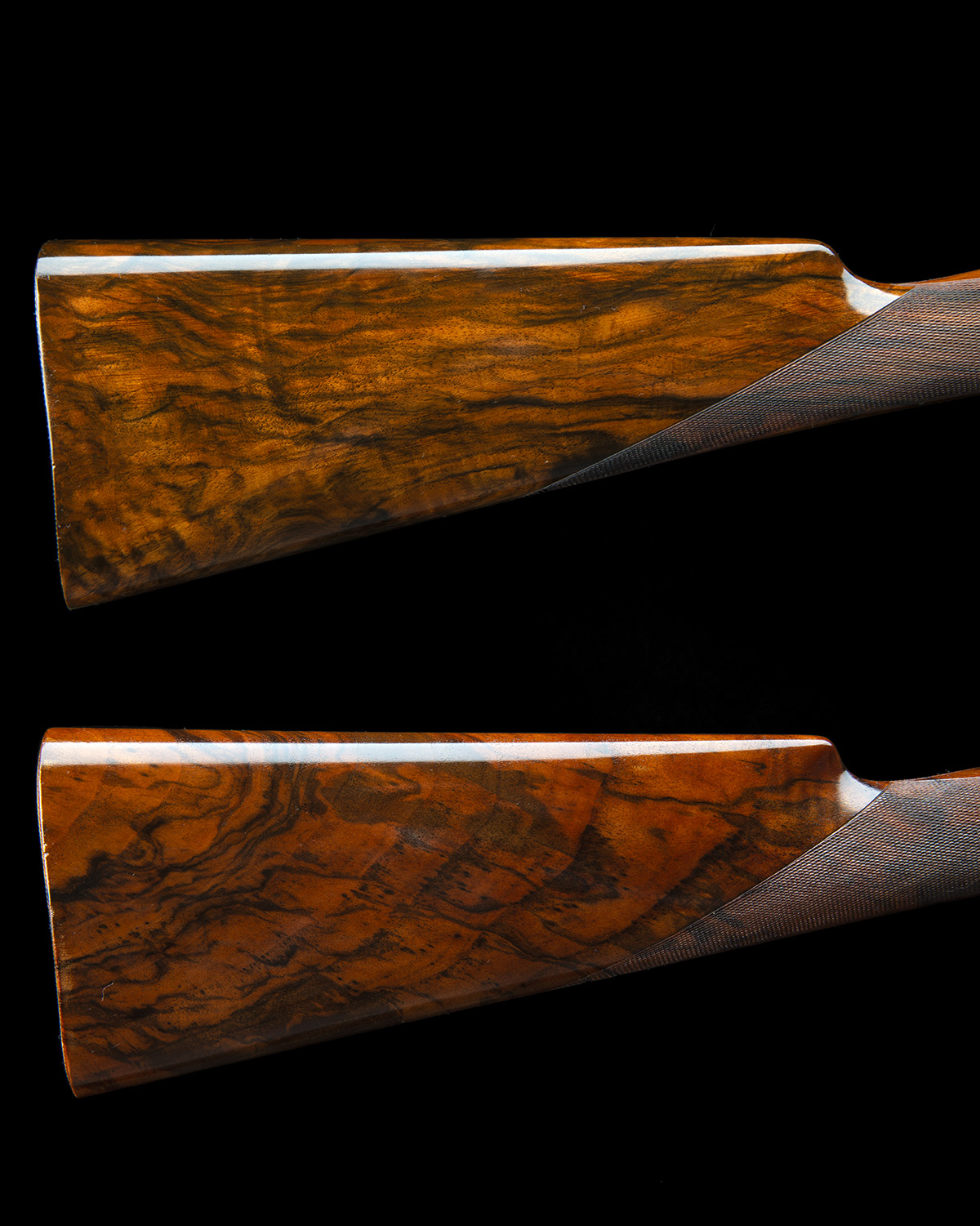 30in. nitro barrels with 7mm ventilated matt top-ribs, gold-inlaid '1' and '2', 2 3/4in. chambers, bored approx. 1/4 and 1/2 choke in both, hold-open toplevers gold-inlaid '1' and '2', automatic safeties with integral triggerplate release catches, gold-washed selective single triggers, gold-washed lockwork, fine bouquet and scroll engraving, triggerplates signed 'LOSIO. F. inc.', bright finish, 15 1/4in. boldly-figured stocks, weight 7lb. 12oz. (no.1), 8lb (no.2), in their Nizzoli lightweight leather motor case
