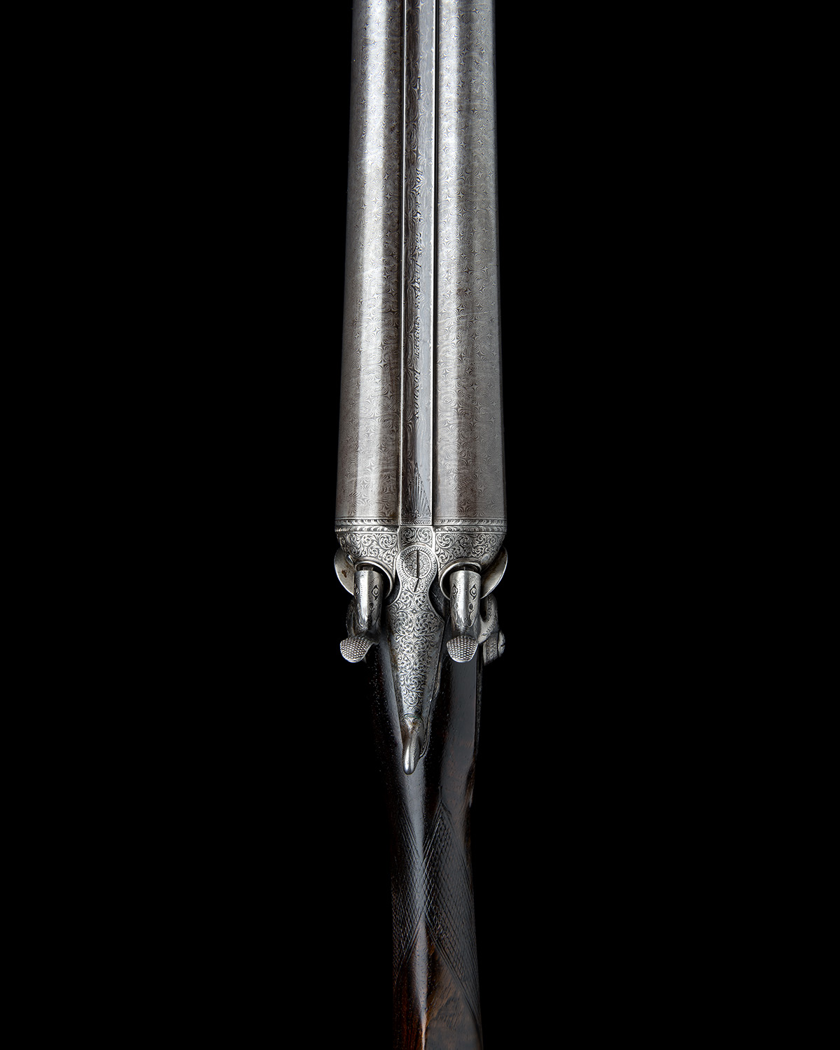 30in. black powder only damascus barrels (bore measurements marginal, some pits and dents), the rib engraved '1' and 'BOSS & CO. 73. ST. JAMES'S STREET. LONDON.', 2 1/2in. chambers, bored approx. true cyl. in both, carved percussion fences, cocking indicator studs, non-rebounding locks with dolphin hammers, fine border and acanthus scroll engraving, retaining some original colour-hardening and finish, 13 3/4in. figured stock with steel buttplate, weight 6lb. 10oz., in its makers leather case.