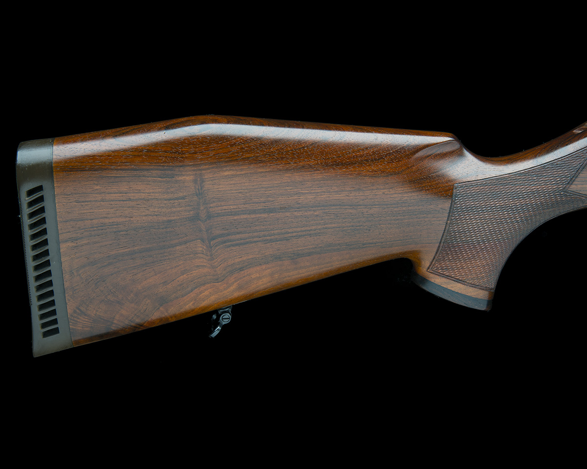 23 5/8in. nitro barrel with ramp-mounted open sights and ramp-mounted blade fore-sight, receiver, bolt and furniture carved with oak leaves and acorns, the rear of the receiver carved in high relief with a game scene of running deer, detachable box magazine, the floorplate carved in high relief with a chamois, gold-washed set trigger, pistolgrip stock with cheekpiece and hogsback comb, sling swivels, 14in. pull including 3/4in. ventilated rubber recoil pad, weight 7lb. 8oz.