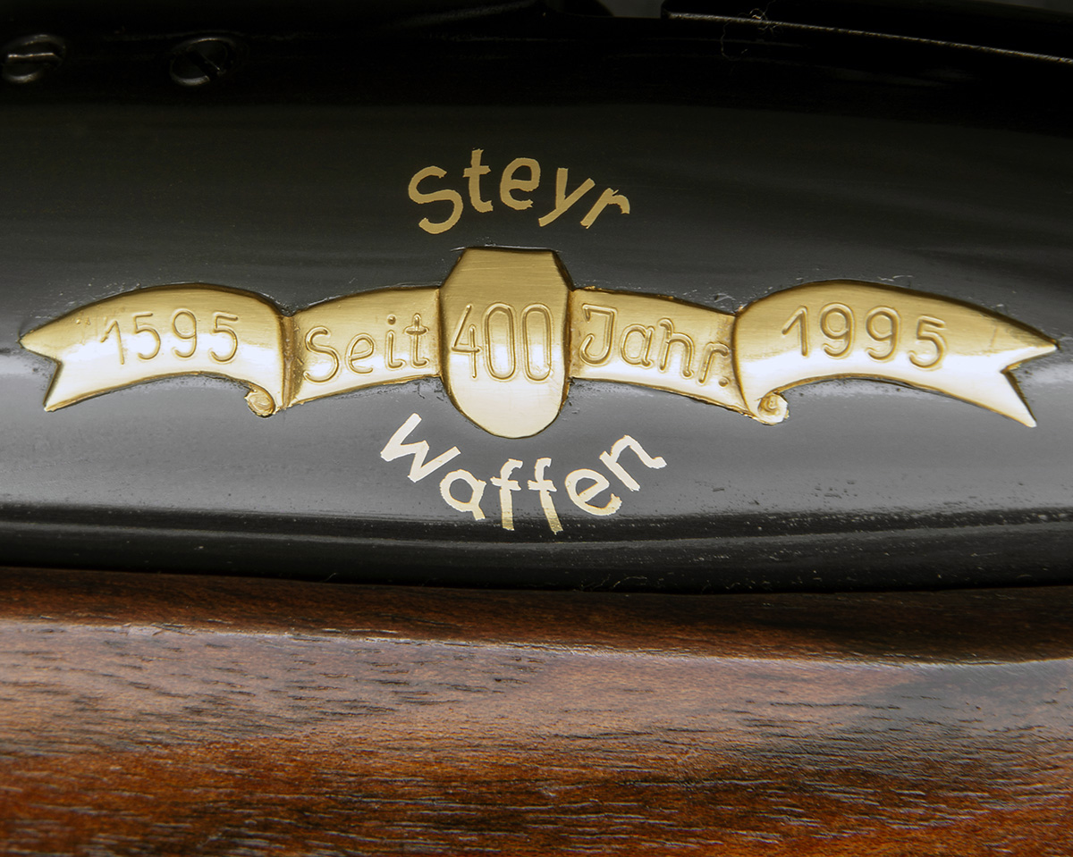 23 1/2in. nitro barrel with open sights and ramp-mounted blade fore-sight, blacked receiver gold-inlaid '*35*' and with 'STEYR WAFFEN' in gold with a gold-inlaid banner engraved '1595 - seit 400 jahre - 1995', roller safety, gold monogrammed detachable box magazine with 'M95' and '100 Jahre', gold-washed set trigger, well-figured pistolgrip stock with sculpted cheekpiece, hogsback comb, sling swivels, 14 1/2in. pull including 3/4in. ventilated rubber recoil pad, weight 7lb. 9oz.
