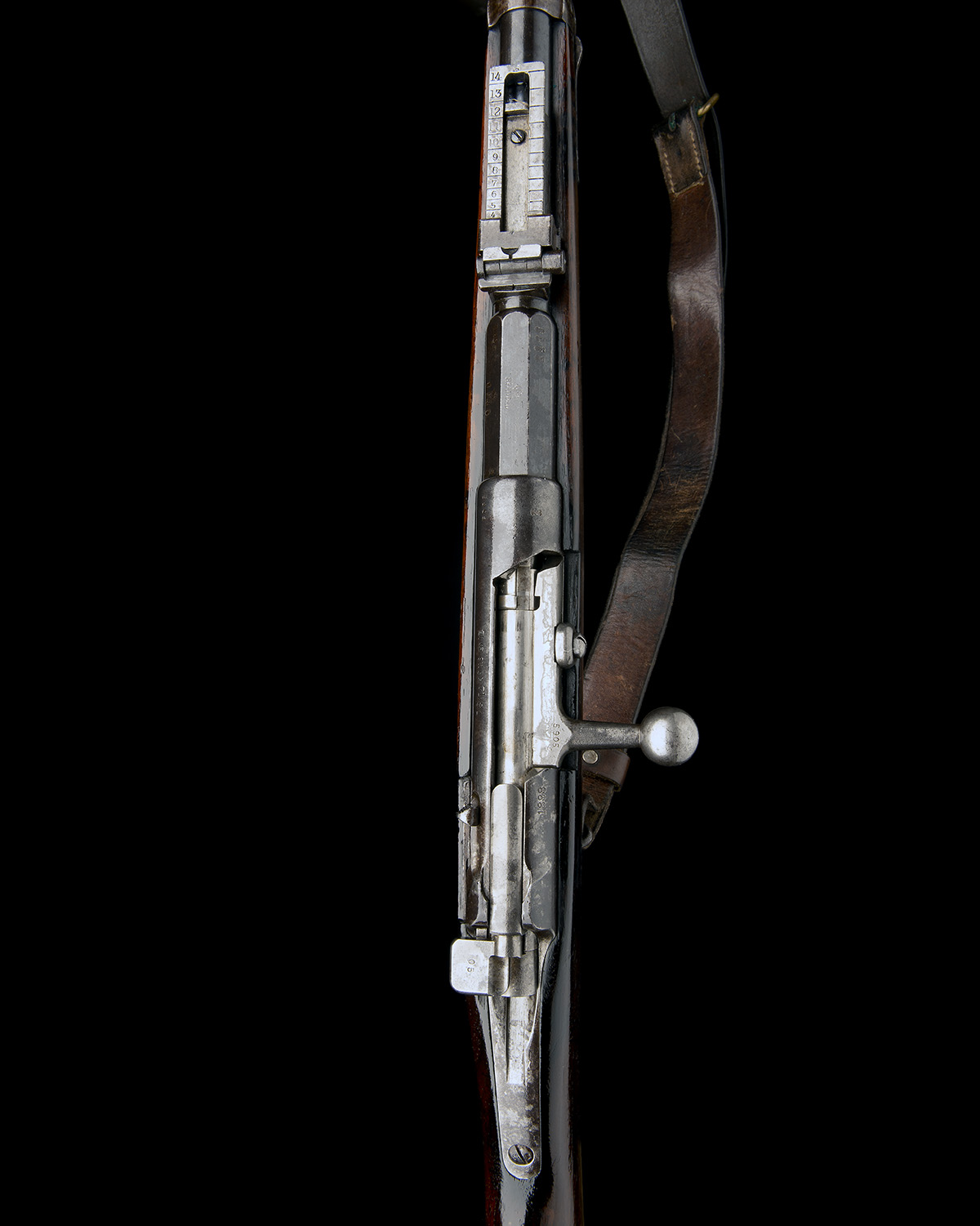 dated for 1888, with 32in. barrel, block and blade fore-sight, elevating ladder rear-sight, octagonal breech-section, round bolt-housing with straight handled bolt (matching number), flag safe, magazine cut-off to left hand side, walnut full-stock with iron furniture, two barrel-bands, iron nose-cap with stacking-spike and concealed under-barrel magazine, complete with a later leather sling