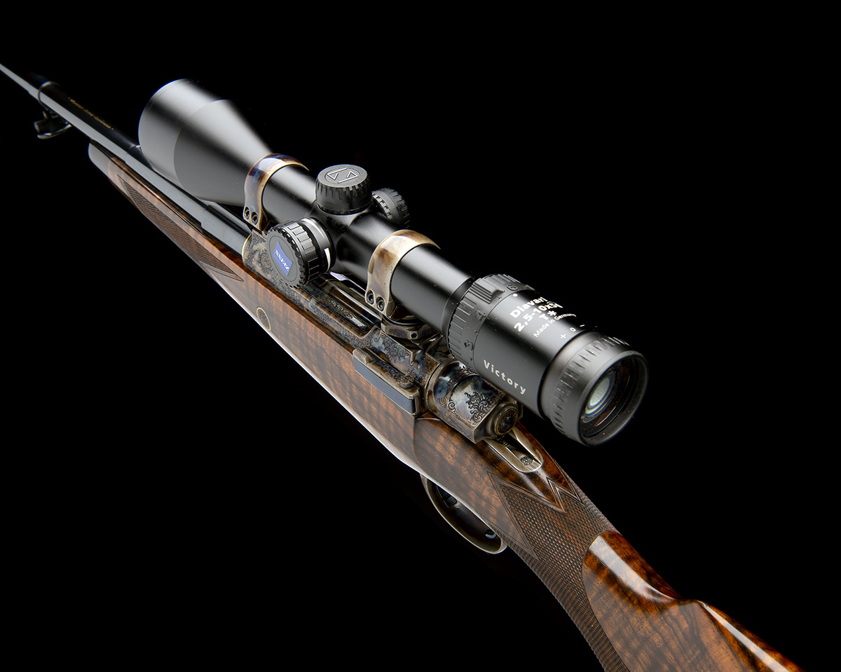 23 1/2in. nitro BARREL gold-inlaid ' .WAFFEN JUNG. LOHMAR.', short finely matted sight-rib with dot detailing and gold-inlaid with the calibre designation, open sights with gold-inlaid sight line and marked '100', ramp-mounted pyramid fore-sight, gold band detail to the knox form, the receiver (with solid side wall) mounted with a Zeiss Victory Diavari 2,5-10x50 T* telescopic sight, serial no. 3188845, in colour-hardened quickly-detachable mounts, colour-hardened bolt with progressive radial cut chequering and gold highlighting, safety with gold-inlaid 'F' detail, florally-engraved recoil blocks with gold line border, hinged straddle floorplate with push release, the receiver and furniture finely engraved with acanthus scrollwork and retaining virtually full original colour-hardened finish, highly-figured pistolgrip stock with cheekpiece, engraved and colour-hardened steel pistolgrip-cap, sling swivels, horn finial, 14 5/8in. pull including 1/2in. leather covered recoil pad, weight 8lb. (unscoped) and 9lb. 8oz. (with scope)