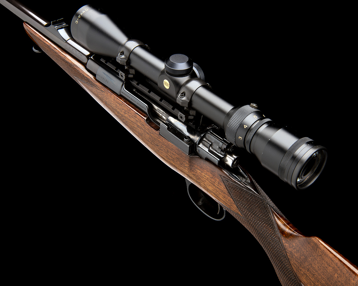 21 1/2in. replacement nitro barrel with block mounted folding leaf sights (unmarked) and ramp-mounted bead fore-sight, the receiver (with thumb cutout) mounted with an EIB 3-9x40 telescopic sight on a picatinny rail, the receiver ring with Mauser serial number 82193, the side wall engraved 'WAFFENFABRIK MAUSER-OBERNDORF A/N', the right of the receiver tapped, detachable floorplate with military style release, triggerguard serial numbered 3602 (possibly a Rigby number), figured semi-pistolgrip stock with sling swivels, 14 3/8in. pull including steel buttplate, weight 8lb. 7oz.