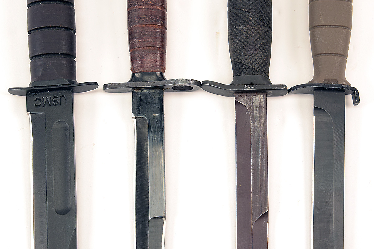 FOUR MILITARY TYPE SHEATH-KNIVES, including a US M8 in an M8A1 scabbard, a late M3 type in a hard plastic scabbard with integral webbing frog, a green Glock 'bayonet with scabbard and a USMC bowie signed Kabar with leather scabbard