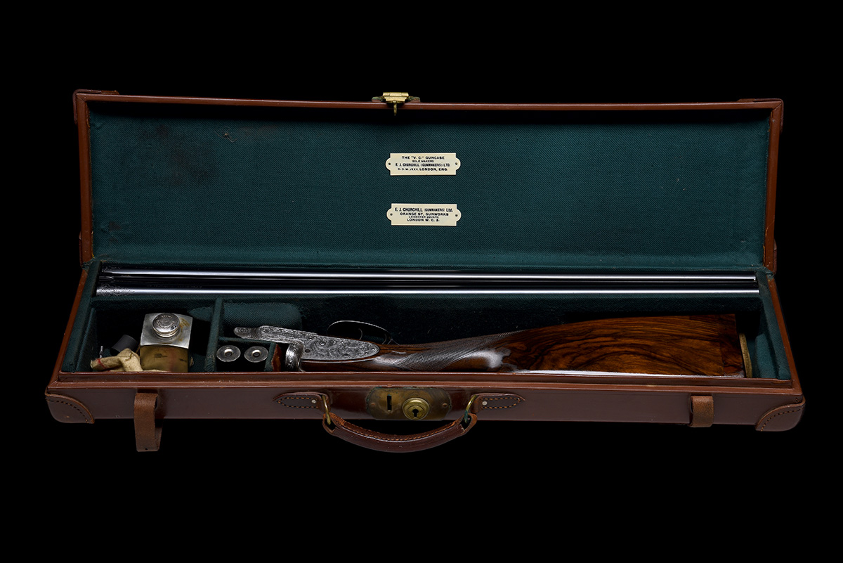 1940 - 1944, 25in. nitro chopperlump barrels, matt Churchill-rib gold-inlaid 'XXV' at the breech end, the tubes engraved 'E.J. CHURCHILL. (GUNMAKERS). LTD. ORANGE STREET GUNWORKS. LEICESTER SQUARE. LONDON.' and with a flash of scrollwork at the breech ends, 2 1/2in. chambers, bored approx. 1/4 choke in both, slender fences, automatic safety with gold-inlaid 'SAFE' detail, gold-inlaid cocking-indicators (right missing inlay), double rolled-edge triggerguard, border and profuse acanthus scroll engraving, bright finish, 14 1/4in. figured stock including 3/4in. wooden extension, weight 6lb. 2oz., in its makers tan leather 'V.C.' guncase