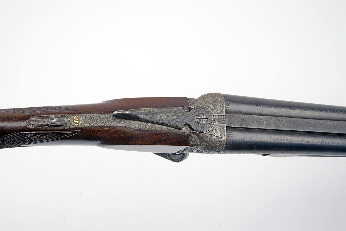 R.B. RODDA & CO. .32-40 (WINCHESTER) BOXLOCK EJECTOR DOUBLE RIFLE, serial no. 6961, circa 1912, 24in. nitro barrels with file cut sight rib, open sights and two folding leaf sights, white metal inlaid sight lines and marked '1', '2' and '3', ramp-mounted bead fore-sight, the tubes engraved 'R.B. RODDA & CO. 2. WELLESLEY PLACE. CALCUTTA & 24. WHITTALL STREET. BIRMINGHAM', treble-grip action with short side bolsters, automatic safety with gold-inlaid 'SAFE' detail, deep carving of game scenes of Indian deer and antelope with jungle foliage (some wear overall) gap to floorplate / triggerplate join, ejectors at fault, 14 3/8in. replacement pistolgrip stock with decorative pistolgrip-cap, replacement fore-end wood, weight 6lb. 11oz.